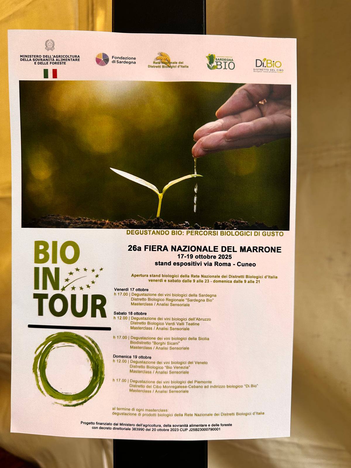 Bio in Tour, progetto di promozione del biologico in dieci regioni d’Italia, della durata di due giorni ciascuno durante i quali si terranno altrettanti incontri/seminari, tavoli consulenziali ed eventi di degustazione e promozione e si terrà nelle regioni: Sardegna, Calabria, Marche, Lazio, Abruzzo, Sicilia, Emilia Romagna, Piemonte, Molise e Toscana. Lo scopo dei seminari sarà quello di contribuire al potenziamento e all’innovazione dei sistemi locali attraverso interventi orientati ad offrire un apporto corretto allo sviluppo economico del territorio attraverso la formazione e informazione sul settore biologico e le sue opportunità partendo dall'adesione ai bio distretti territoriali. I temi varieranno appuntamento per appuntamento: si parlerà degli antichi mestieri e delle pratiche agronomiche, della professionalità degli operatori delle filiere BIO e delle opportunità economiche del Biologico. Si parlerà anche di formazione sulle tecniche di agricoltura BIO e del valore delle produzioni BIO. Eco-sostenibilità e agricoltura BIO in Italia con focus sull'organizzazione tra gli operatori della filiera. Particolare attenzione verrà data al marketing e allo sviluppo locale e alle azioni di promozione nei mercati europei ed esteri. Infine si esporranno le opportunità dei Contratti di filiera e le azioni di collaborazione tra istituzioni locali e produttori BIO per la programmazione dello sviluppo territoriale con i Bandi di Distretto. Protagonista sarà anche il tema dell’agricoltura sociale che, per quanto la struttura socio economica delle aziende partecipanti sia costituita prevalentemente da attività operanti nel settore primario, si punta ad una trasformazione significativa del rapporto frasoggetto svantaggiato e realtà sociale, trasformando quest’ultimi da elementi gravosi della società a risorse attive e forze trainanti per le realtà produttive del settore primario.